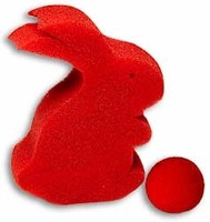 The magician displays a red sponge ball and claims that he will actually make it disappear in front of the spectator's eyes. Slowly and methodically, he places the ball into his trouser pocket and claims, "It's gone!" After the groans have died down, he offers to do it again-this time for real. He places the ball on top of his left closed fist and pushes it down inside. When he opens his hand the ball is seen to have changed into a large (7 inches tall) sponge rabbit!
