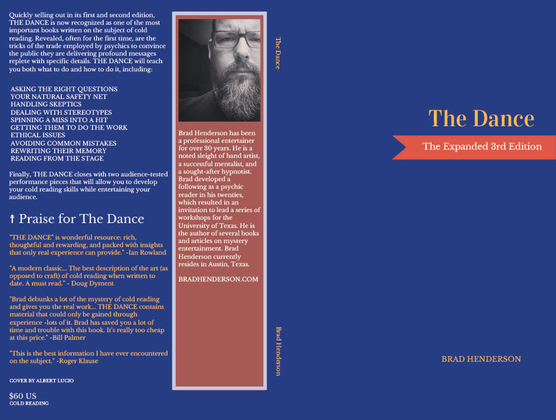 "If you are like most mentalists, you have considerable unused capacity that you have not turned to your advantage. At times you have had serious doubts as to whether you have done the right thing by spending your time and money on books full of cold reading scripts and rehashed Forer Statements. If you think that cold reading is all about The Barnum Effect or population stereotypes, you desperately need to read Brad Henderson's book, The Dance. The 1st Edition of The Dance was a smart and important book and the Expanded 3rd Edition is better still. If you're an independent thinker who has become dissatisfied by the restrictions and limitations of traditional readings, you will appreciate the intelligence and variety that Henderson's book provides. Highly recommended." - Michael Weber