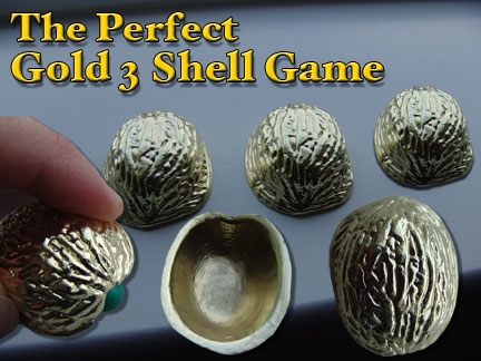 Three shells (made in brass and then plated in gold twice), 3 rubber peas, and a deluxe carrying case.
