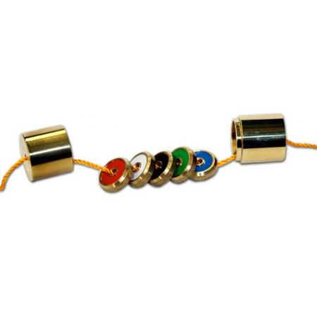 Five colored brass discs are displayed. The spectator is asked to flip the discs over and mix them up, hiding the different colors. The spectator selects a disc and is asked to place all the face down discs in the container. The container is sealed and a string is run through its center. Magically, the performer is able to make the selected disc escape from the string of discs and drop out of the chamber!