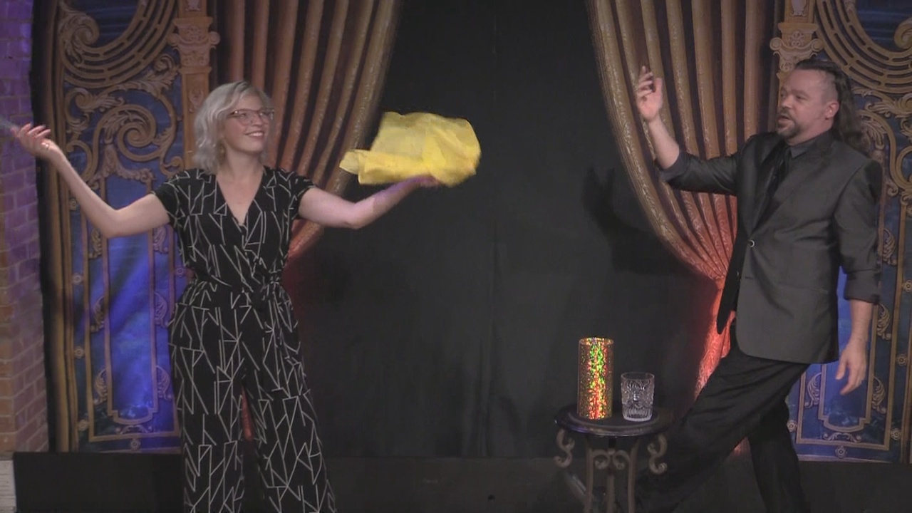 The L.W. Bewitched Handkerchief and Glass: A funny, interactive spectator-as-magician trick with a surprise vanish of a glass and its eventual return with a teleporting silk handkerchief.