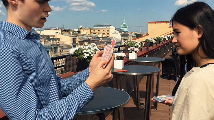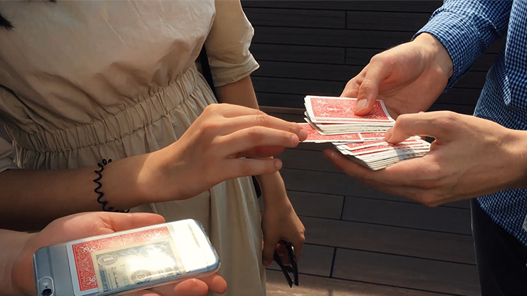 From your pocket, you remove your phone and a deck of playing cards. A transparent phone case is protecting your phone. Inside, on the back of the case, they can see some everyday items, perhaps a bill, train ticket, receipt, etc., and... one playing card!