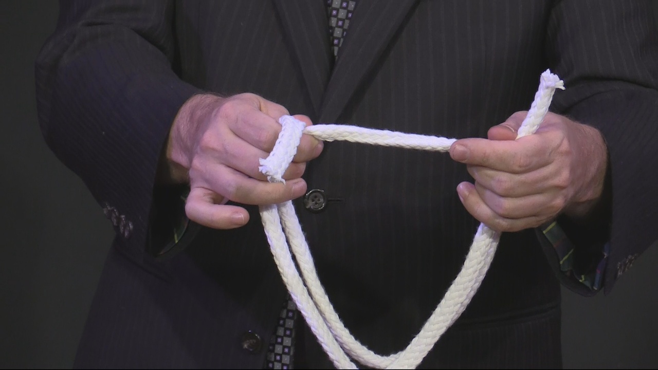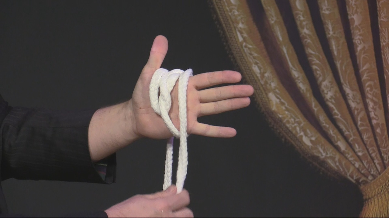 Tarbell's Rope Mystery Method 1: A spectator clearly cuts the rope himself into two obviously separate pieces which are tied together and magically melt back into one.