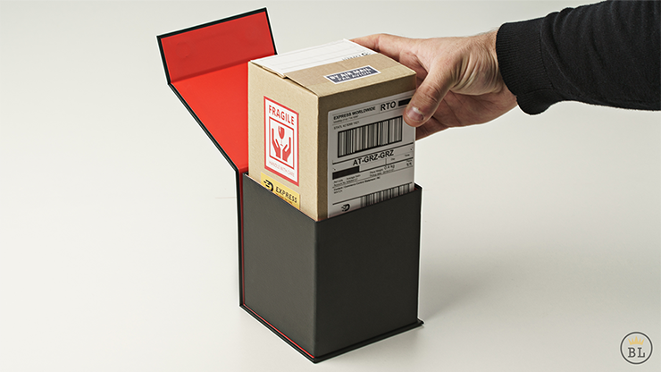 A beautifully packaged box is placed on a table before the performance begins. The magician then borrows any small object from the audience, has it signed then makes it vanish!