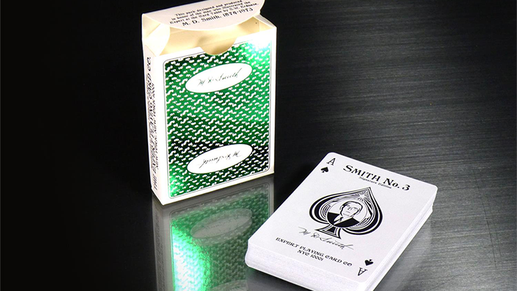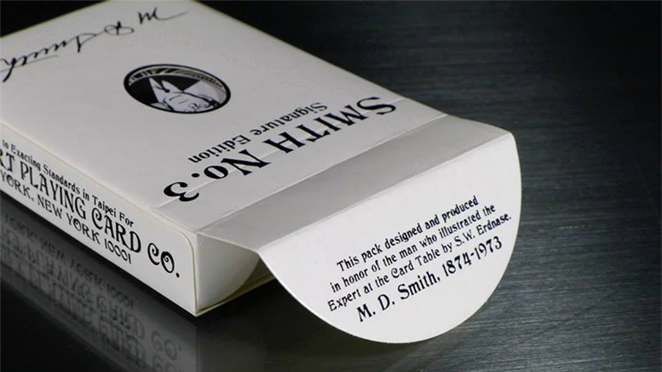 The signature, of M.D. Smith, was carefully recreated from an old signed copy found in the Conjuring Arts Research Center's private collection. The Ace of Spades has a rendering of Mr. Smith's face and the tuck has a die cut hole so you can see Mr. Smith while the deck is closed.