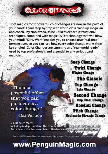 You could spend hundreds of dollars and hours of research trying to find the most powerful color changes on video, books and DVDs. You would have to spend performance after performance testing out these unfulfilling knuckle busters, only to be left cold without any real working material. I?ve done this for you. I?ve spent nine years of trial and error, and now I'm delivering to you THE DVD on color changes.