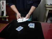 before starting there is a card on top of the visible case, a signed card is chosen and lost in the middle of the deck this card goes up to the top of the deck repeatedly, the card that has been in view at all times is shown and turns out to be a previously signed card