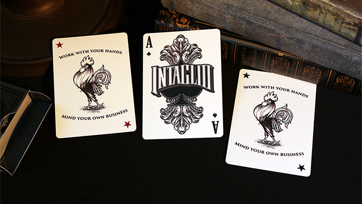 Intaglio is a series of prints and playing cards derived from hand-engraved copper printing plates printed in the traditional Intaglio style. It was produced in a collaboration between Kings Wild Project and Thornwillow Press in New York. Intaglio printing for playing card art has not been used for centuries. Why has this art style been lost? For this art and printing style to come to life, several factors must exist and come together at the same time. One factor is the skill of the artist. Intaglio engraving takes years of patience and practice in order to become proficient. Another factor is that the equipment is not readily available. And lastly, finding someone with the equipment plus the ability to print them at a high archival quality is near impossible. One can see why attempting a project like this is a monumental task.