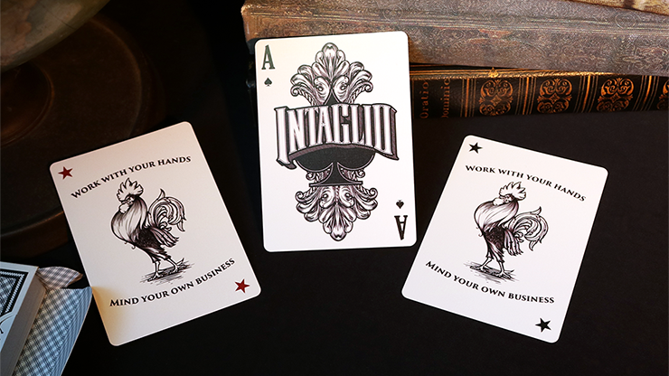 Intaglio is a series of prints and playing cards derived from hand-engraved copper printing plates printed in the traditional Intaglio style. It was produced in a collaboration between Kings Wild Project and Thornwillow Press in New York. Intaglio printing for playing card art has not been used for centuries. Why has this art style been lost? For this art and printing style to come to life, several factors must exist and come together at the same time. One factor is the skill of the artist. Intaglio engraving takes years of patience and practice in order to become proficient. Another factor is that the equipment is not readily available. And lastly, finding someone with the equipment plus the ability to print them at a high archival quality is near impossible. One can see why attempting a project like this is a monumental task.