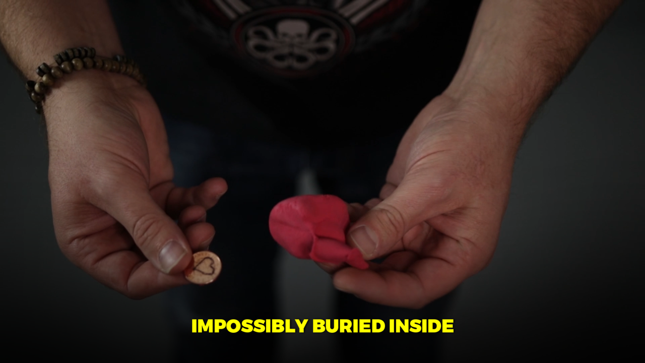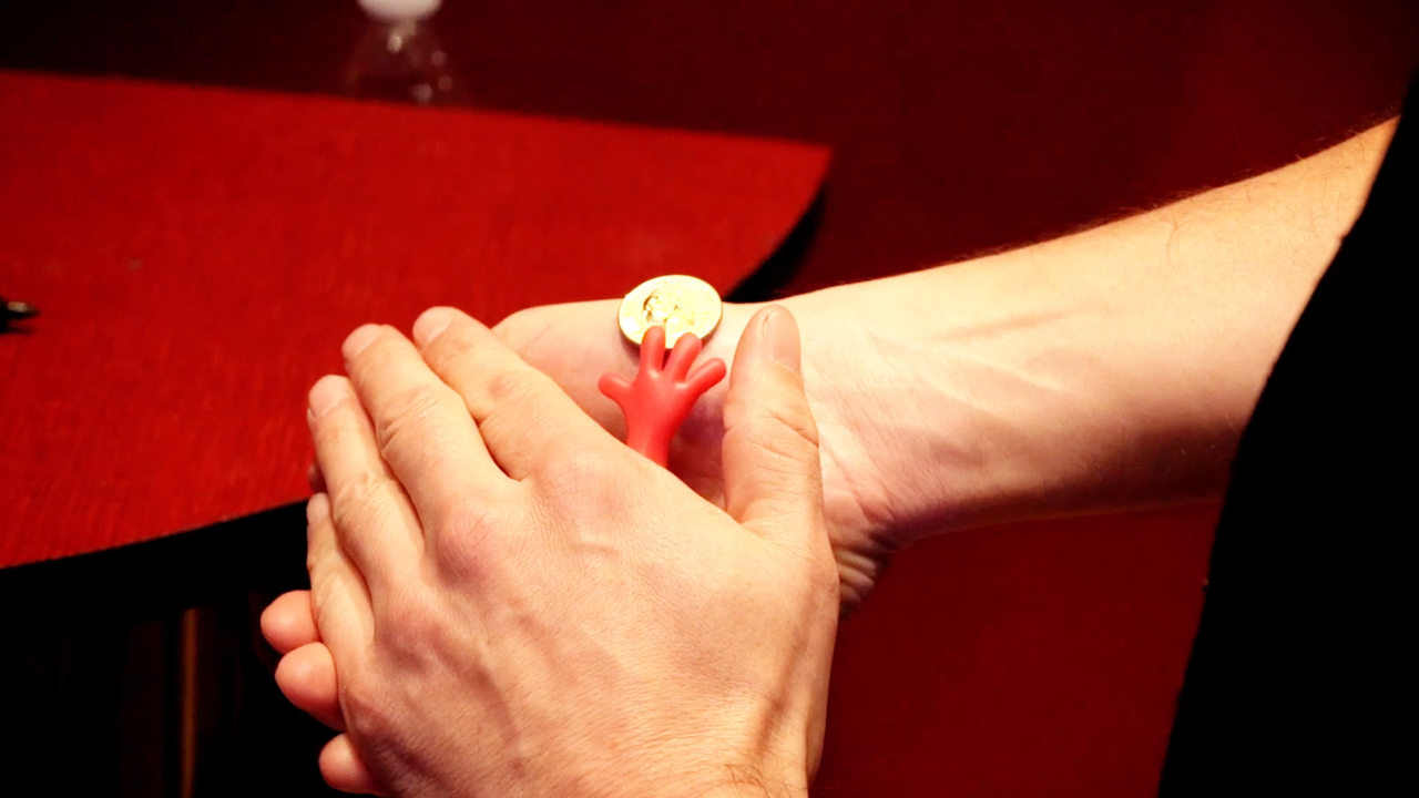 A coin is borrowed from a spectator and initialed on both sides. You then introduce a little hunk of clay. The spectator rolls the clay into a ball. The coin is placed on your hand, and the clay is alongside it. Then, impossibly, a clay hand darts out of your hand and snatches up the coin. You open your hands to reveal the ball of clay has returned to normal, the hand has gone back inside. You then immediately hand the clay to the spectators so they can open it and discover their signed coin inside.