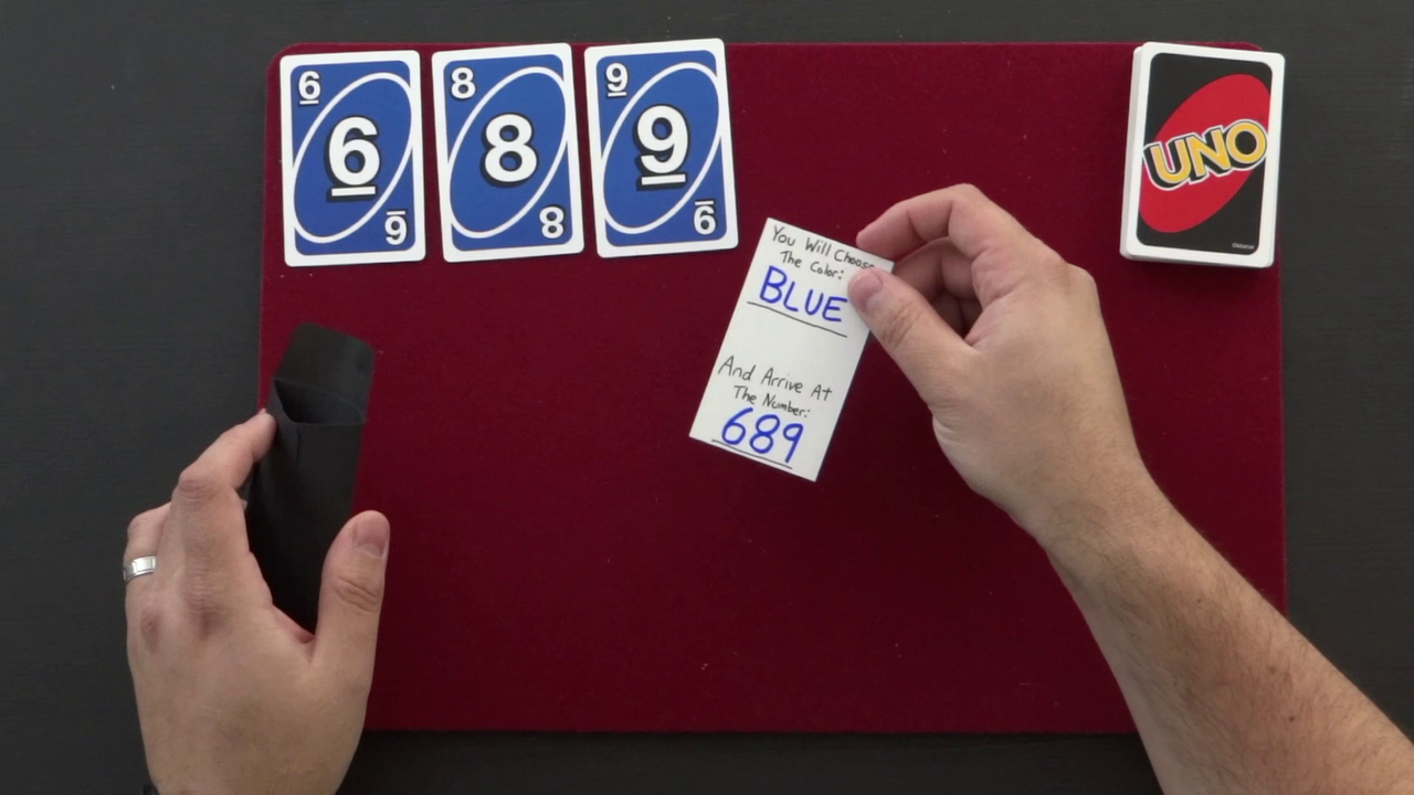 After briefly bringing attention to an envelope in your pocket, you introduce a pack of UNO cards. A participant then names one of the four colors in the deck as their target color. They then take all the cards and genuinely shuffle them into a truly random order. Looking through the shuffled deck, they remove the first three cards of their target color that they come to. The numbers on these cards are added together to arrive at a total. You then remove the envelope from your pocket to show one number was written on it, which matches their total!