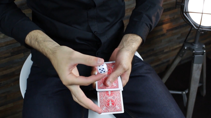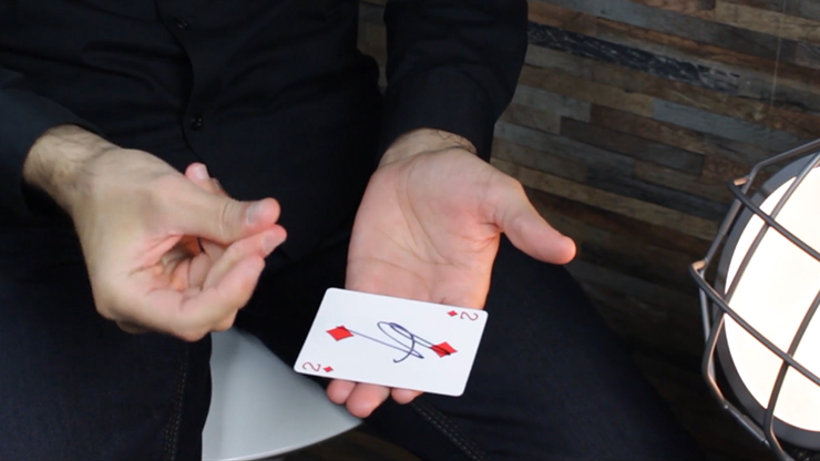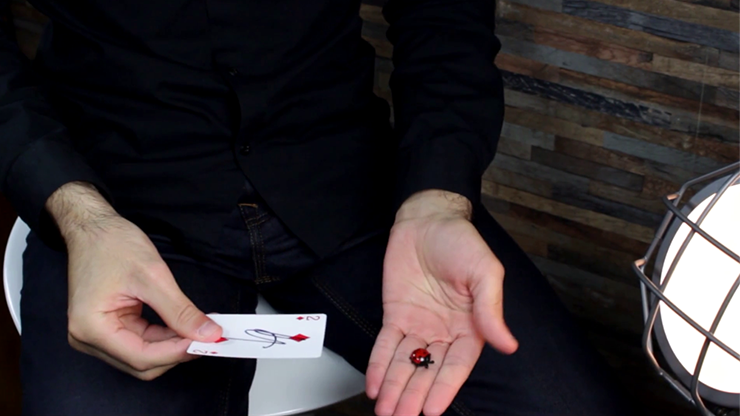 A random card is inserted in the deck but remains visible. You introduce a small ladybug as your assistant to find the selected card. The ladybug is thrown and visually penetrates the card to be printed on it.