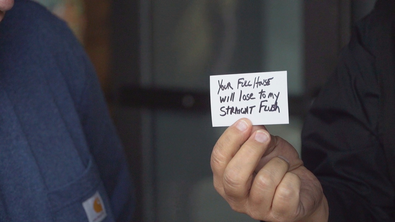 Bannon openly tells the spectator, that he‘s going to setup the cards in aspecial order. I like to misdirect from this by shufflling the cards and having the spectator cut the deck. In my routine the spectator then deals the cards to two other spectators after deciding who he‘s going to deal the winning hand to. I find this much stronger than dealing the winning hand to yourself.