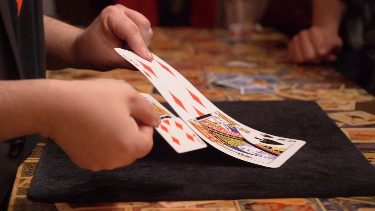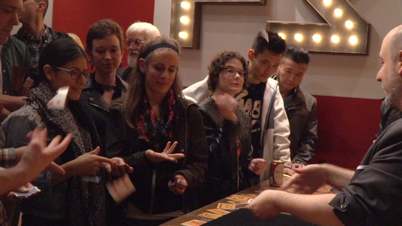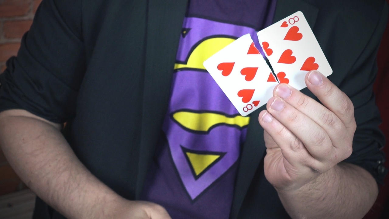 The entire audience is given four playing cards that they shuffle. They then tear those cards in half and shuffle some more. They put one of the torn pieces in their pocket and then shuffle the remaining pieces even further. After eliminating cards by throwing them in the air everyone is left with just one piece of torn card. The audience brings back out the piece that they put in their pocket, and it matches. Every person in the whole audience is successful.