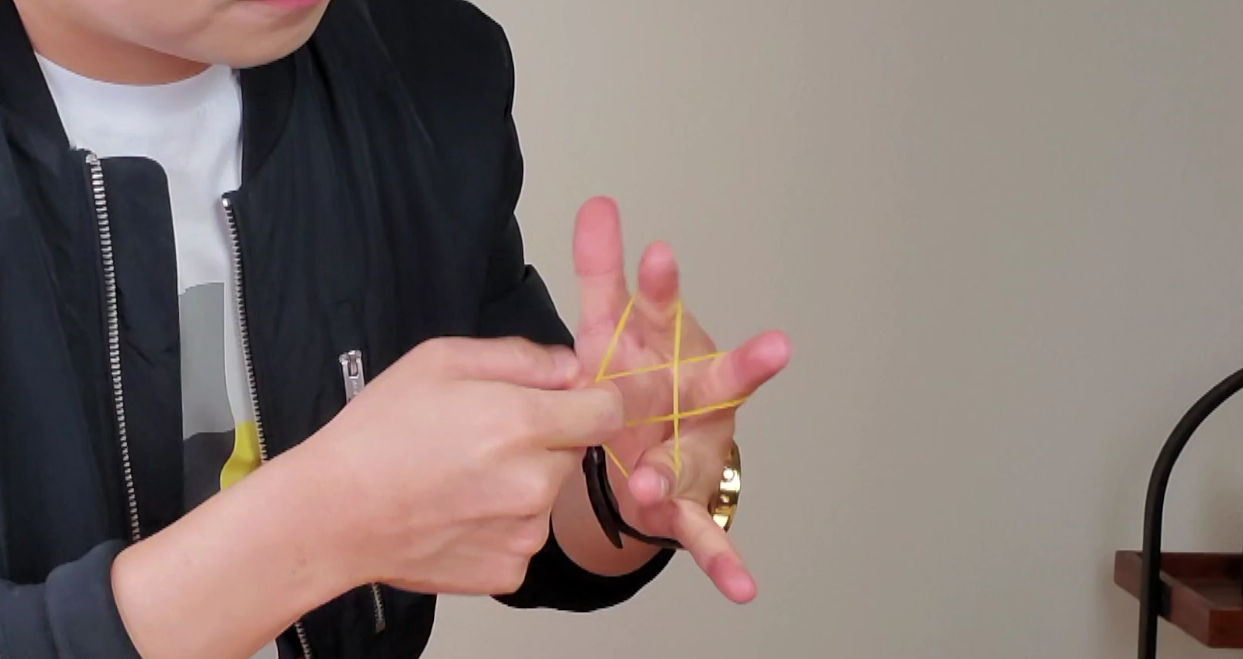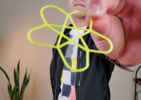 A magician shows the rubberband and makes various shapes. And at the end, the shape looks like 'Two stars'. And then, it magically changes to harden.