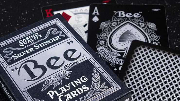 Premium edition Bee Silver Stinger Playing Cards has a cambric finish, thin crushed Premium grade stock and beautifully foiled and embossed tuck box.