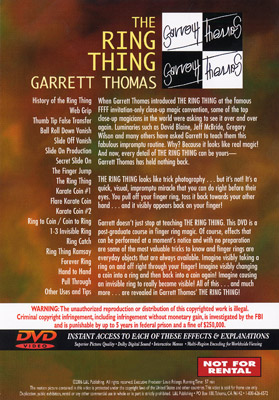 Garrett doesnt just stop at teaching THE RING THING. This DVD is a post-graduate course in finger ring magic. Of course, effects that can be performed at a moments notice and with no preparation are some of the most valuable tricks to know and finger rings are everyday objects that are always available. Imagine visibly taking a ring on and off right through your finger! Imagine visibly changing a coin into a ring and then back into a coin again! Imagine causing an invisible ring to really become visible! All of this . . . and much more . . . are revealed in Garrett Thomas THE RING THING!