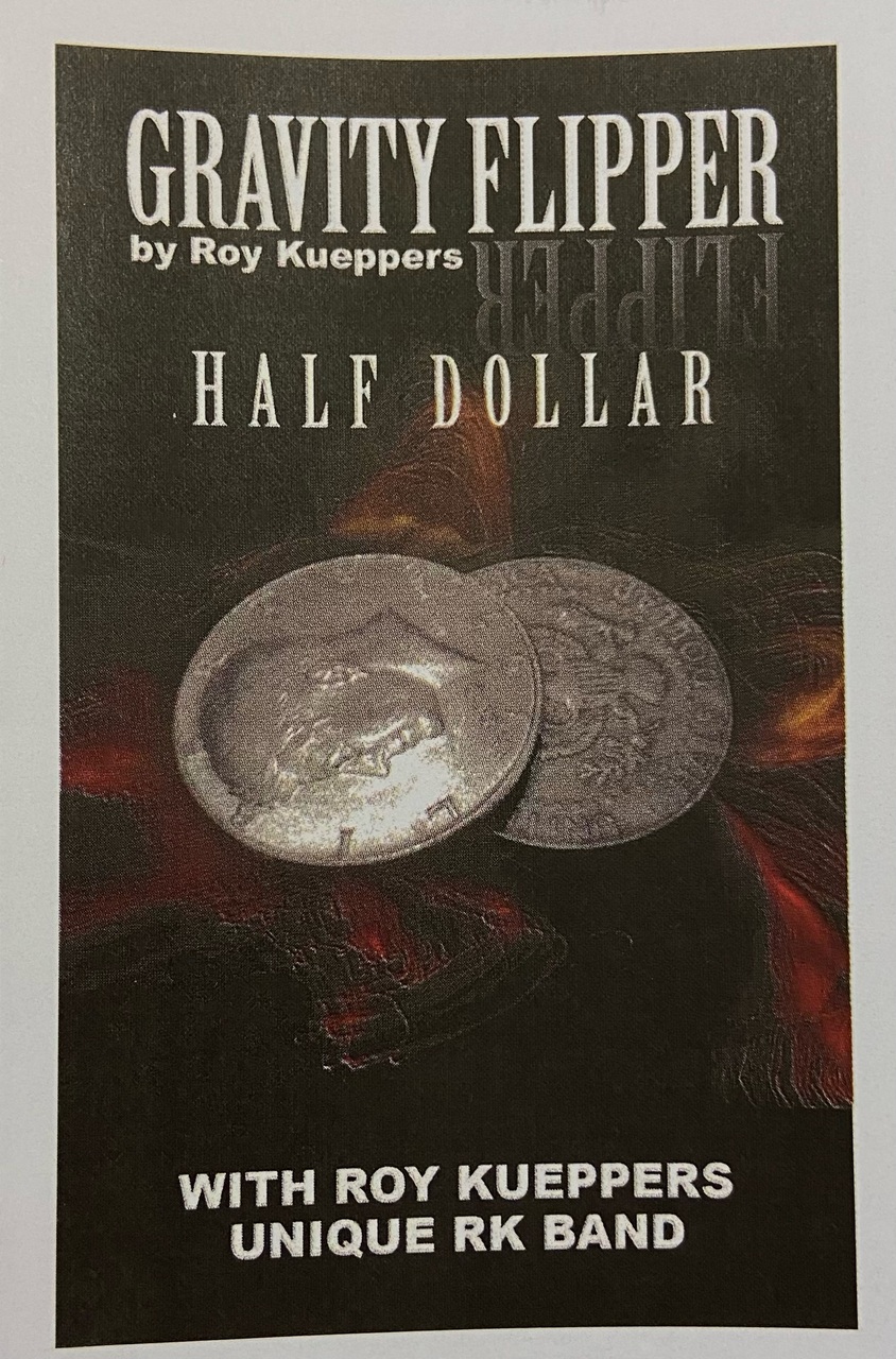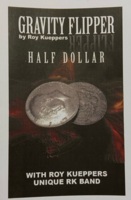 This Flipper coin features my new "RK Band". Its been created and manufactured by Roy Kueppers. These bands have a shelf life of 40 plus years without deteriorating. Meaning that if it sits or is stored for an Extended period of time such as in a Magic shop, Dresser Drawer, Pocket, on a shelf or even Extreme Heat or cold etc it will remain in its original condition. Nothing bothered me more than pulling out my flipper or folding coin and finding that the band was deteriorated which sometimes even crystalized after sitting for a period of time. Even the spare bands were useless as they naturally dried out in the same amount of time. There had to be an answer and this is it.