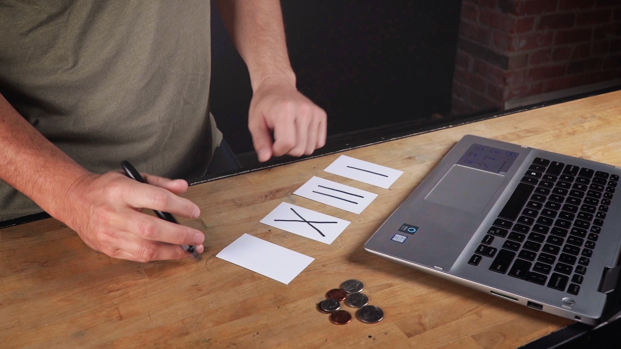 The spectator provides the materials, simple enough that they can be found around the house. Using four index cards (or business cards, or scraps of paper), four designs are drawn. The cards are mixed, then cut or torn in half; there are now eight pieces. A variety of fair actions are followed, with everything away from the performer’s view. The choices are legitimate; two of them involve freely tossing coins. And yet, all of the half-cards end up correctly paired. It’s a baffling series of incredible results.