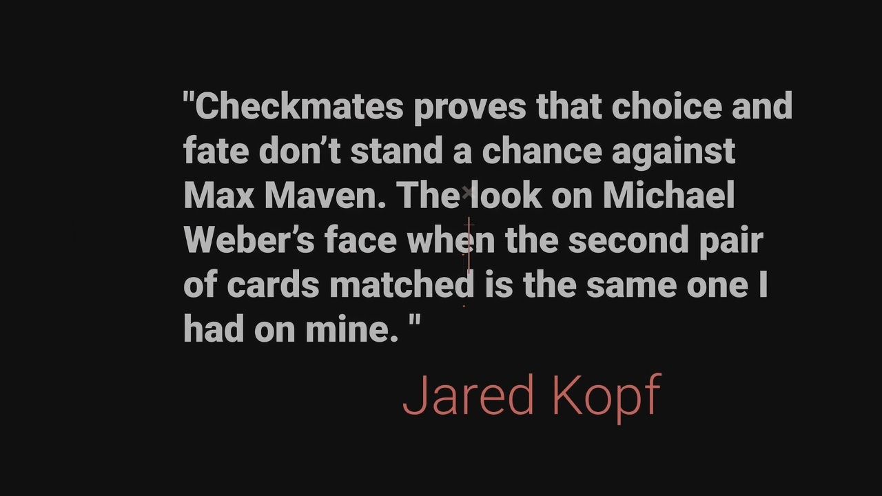 "Checkmates proves that choice and fate don’t stand a chance against Max Maven. The performance is a lesson in itself on how to deliver concise instructions with clarity and wit. The look on Michael Weber’s face when the second pair of cards matched is the same one I had on mine. Best of all the method employs mathematics pioneered by one of my favorite geniuses and early mathemagicians, Carl Friederich Gauss." - Jared Kopf