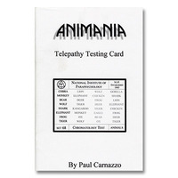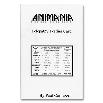 The performer displays a telepathy testing card from the National Institute of Parapsychology. It is explained that this card is from the "chromatology" (study of colors) testing set, and this particular card pertains to animals.