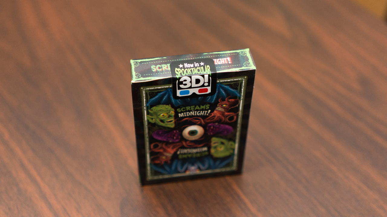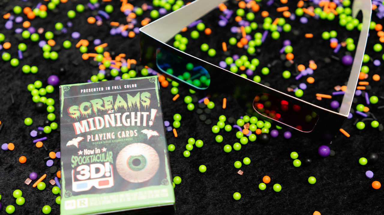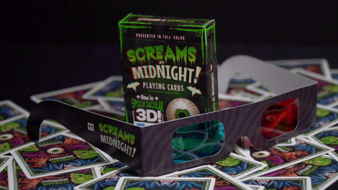 Halloween fright nights are back! Screams at Midnight playing cards celebrate the creepy, fun monster movies of the past. Devilishly delightful creatures adorn the back design. Just like many of your favorite horror flicks, these cards use 3D technology to make the monsters jump right out at you when you wear the included glasses!