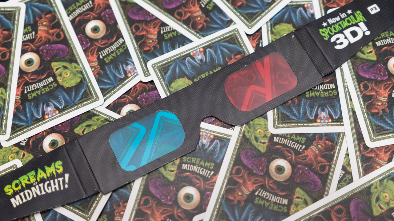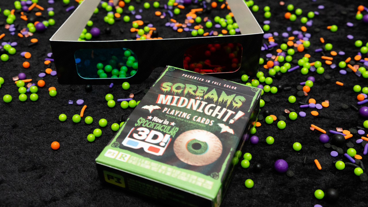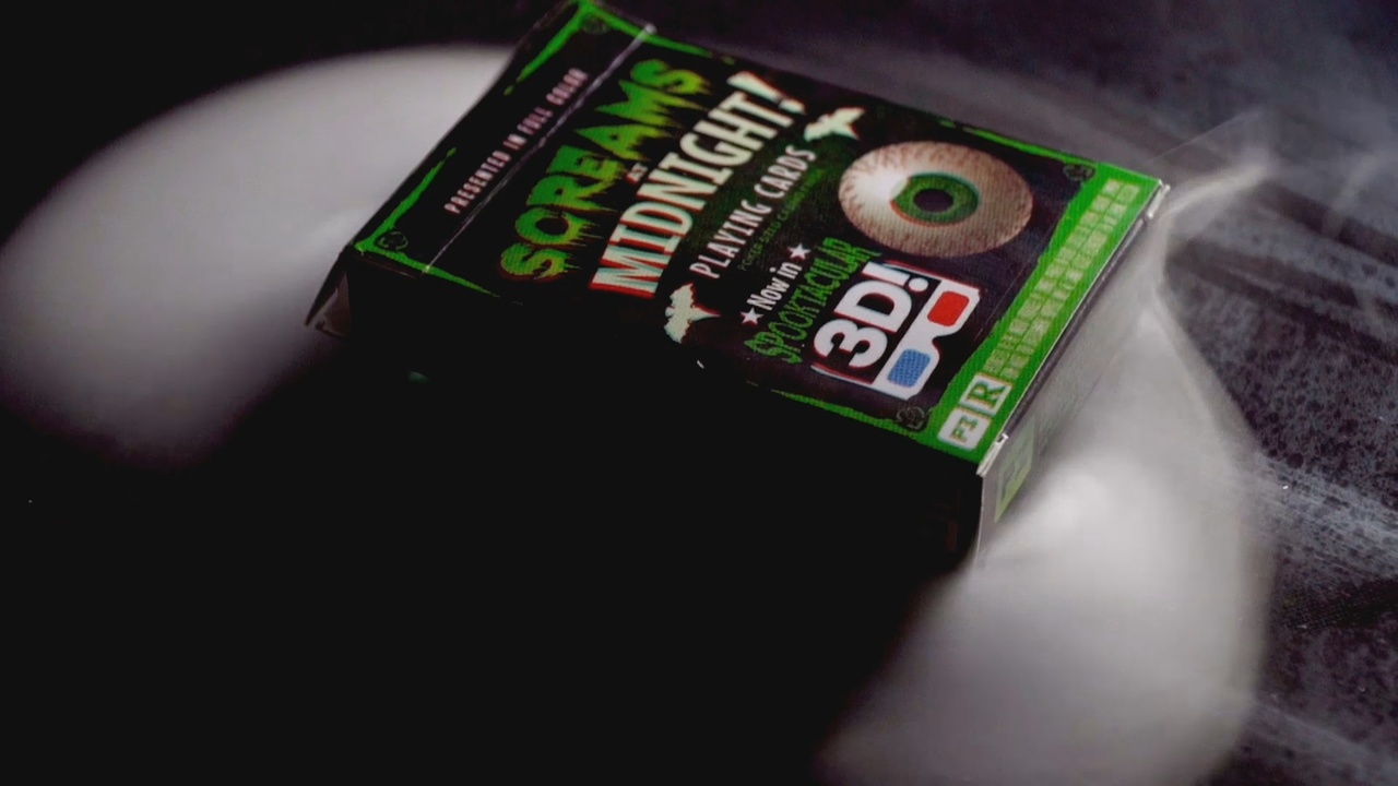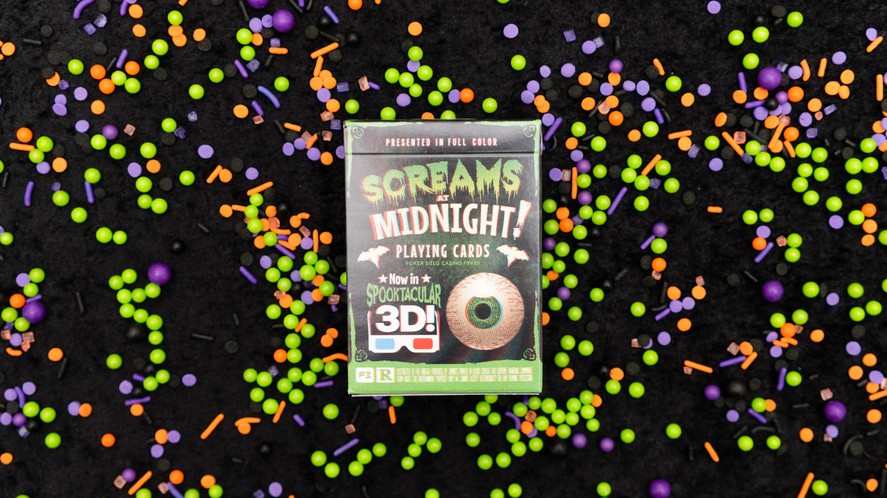 Halloween fright nights are back! Screams at Midnight playing cards celebrate the creepy, fun monster movies of the past. Devilishly delightful creatures adorn the back design. Just like many of your favorite horror flicks, these cards use 3D technology to make the monsters jump right out at you when you wear the included glasses!