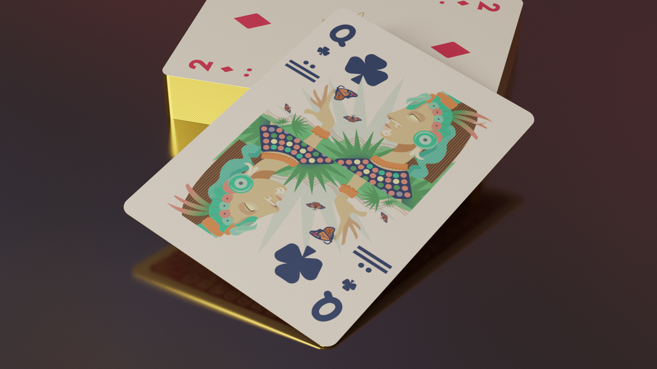All of the court cards and number cards have been created from scratch with eye-catching designs and gorgeous colors. The Jokers are representations of Baldzam, the ritual performers who provided entertainment and social commentary. All of the cards are protected in a custom tuck box with a custom sticker seal.