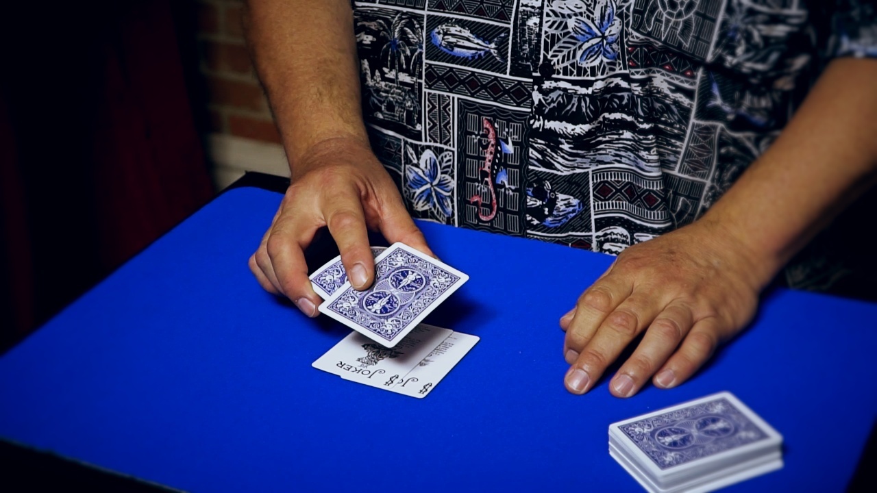 Four red-backed Jokers are shown on both sides to the audience. Two of the jokers are set aside, while the other two are placed back to back. With a magical click, both of those jokers turn blue. The blue jokers are placed on the table and the red jokers are placed back in the magician’s hand. With a magical click, one of the tabled blue jokers changes places with the red jokers. Another click and the second blue joker jumps back in the hand to join the first blue joker. Then with a wave, all the jokers change back to red. For the final phase, the audience may freely select any of the four red jokers, and the magician magically changes that one to blue. All of the cards are examinable at the end.