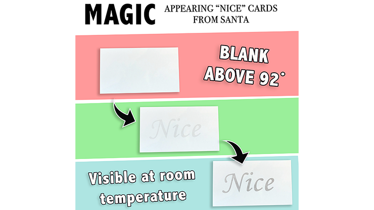 This pack comes with 36 Appearing Business Cards with the word NICE written on them. Perfect for the holiday season! Great to reveal if someone has been naughty or nice. How do they work? There's an amazing secret that you'll find out when purchasing this set. These cards do the work for you.
