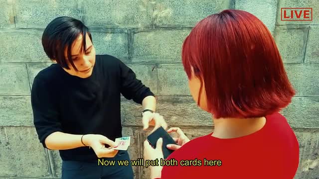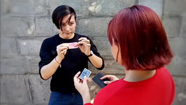 Show two cards to the spectator, tell him to choose one, then fold it and place it between his hands, the card that remains in the hands of the magician will magically become the card that the spectator has and there will be an incredible card transposition!