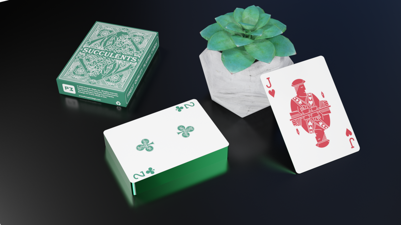 Printed in the USA on traditionally-cut Classic stock with embossed Magic finish by the United States Playing Card Company, Succulent playing cards are printed using vegetable-based inks and starch-based laminates on FSC-certified paper sourced from sustainable forests.