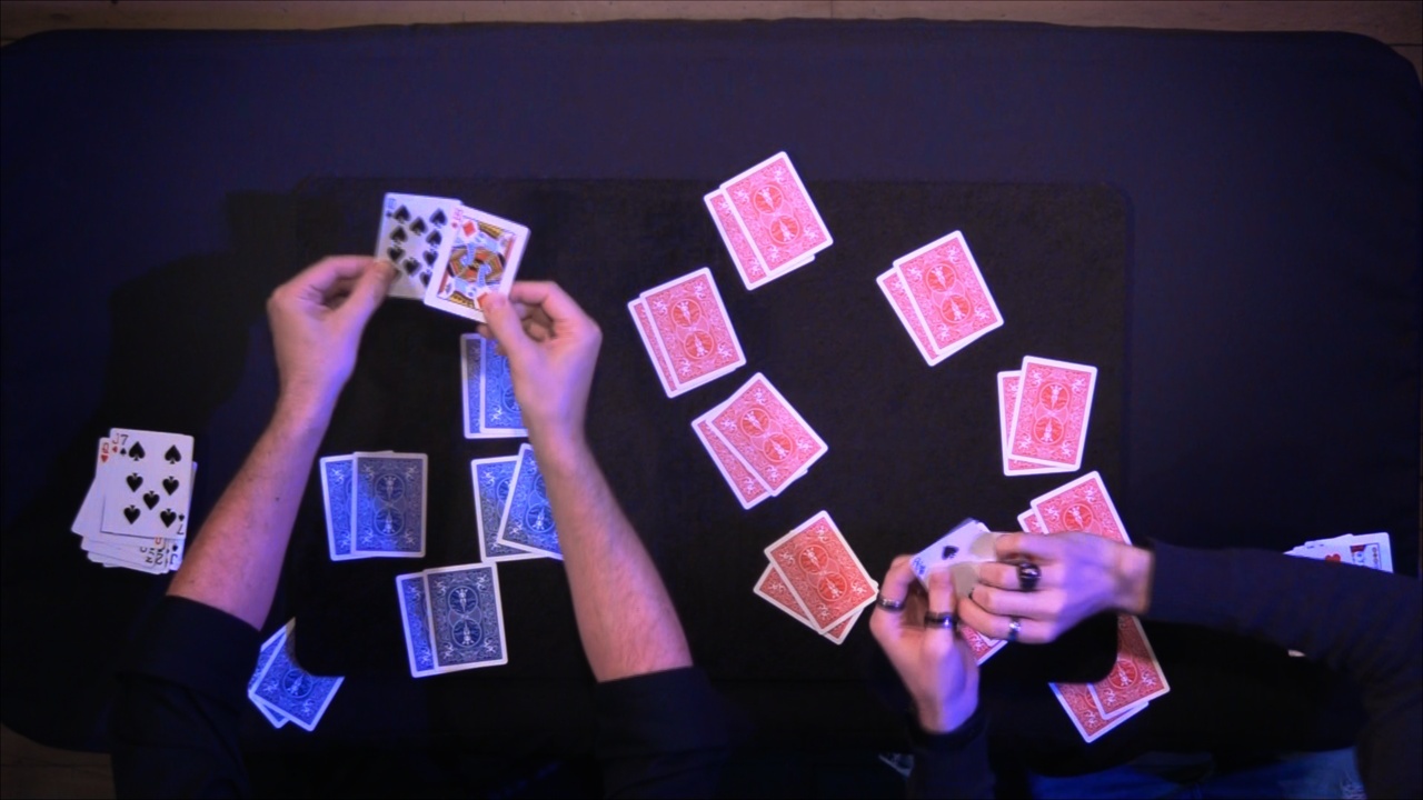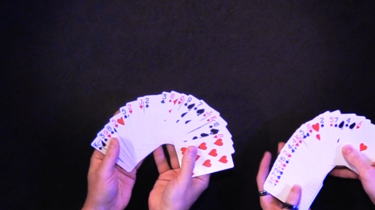 The audience removes a handful of red cards and a handful of black cards from the deck that represent the good and evil in all of us. These cards are thoroughly mixed together. The packet cards is legitimately cut, and legitimately riffle shuffled together. The spectator lays out pairs of cards from the shuffled packet face down on the table, and hides away the pair of cards. This final pair will represent the spectator’s inner good or evil. All of the pairs laid out on the table turn out to be perfectly balanced with one card red and one card black. The hidden away packet? It represents the spectator, and it has two red cards in it because everyone has a little good inside them.