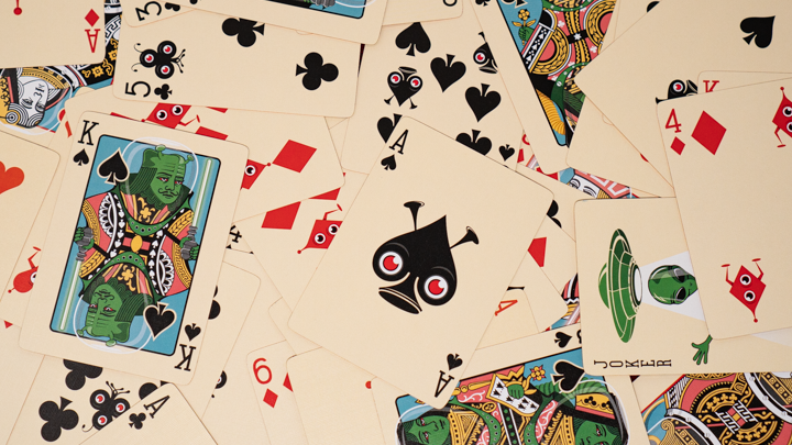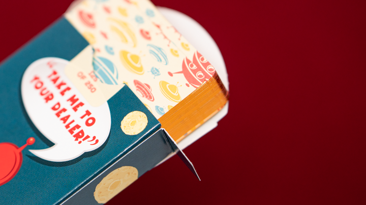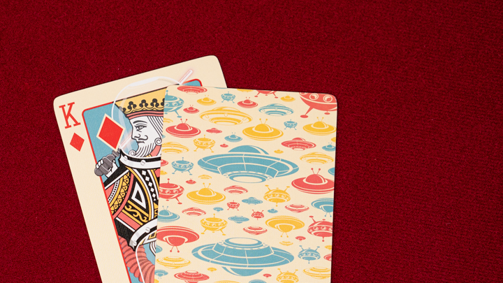 The retro-styled borderless back design has a muted, vintage color palette that's swarming with flying saucers. The faces are chock full of alien creatures ready to beam into your next game. Despite the 100% custom design, the deck has been created with playability in mind, making it perfect for all applications.