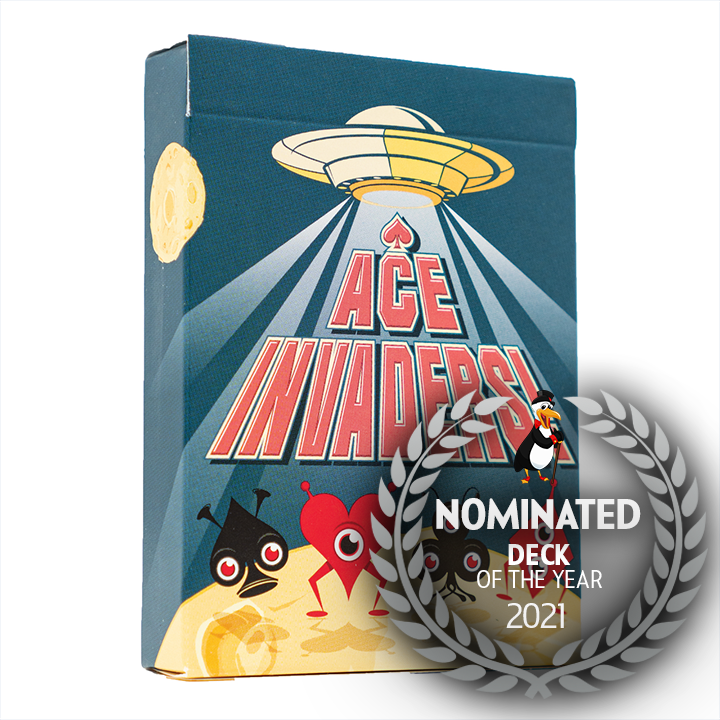 Printed in the USA on traditionally-cut Classic stock with embossed Magic finish by the United States Playing Card Company, Ace Invaders are made using vegetable-based inks and starch-based laminates on FSC-certified paper sourced from sustainable forests. This means the cards not only shuffle, fan, and spread perfectly for all of your favorite games & tricks, they're made with the well-being of the entire planet in mind!