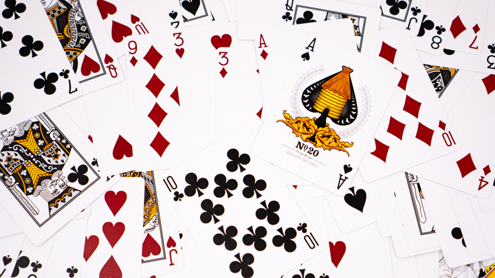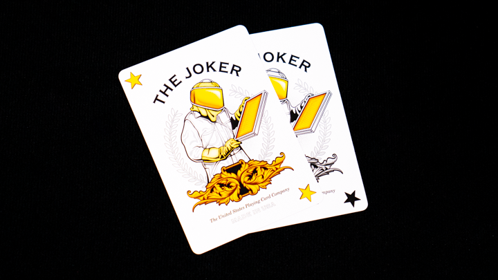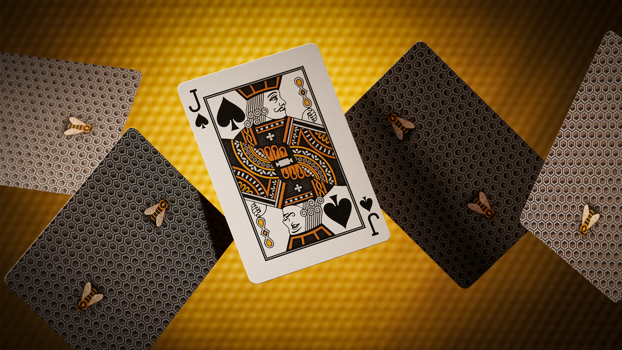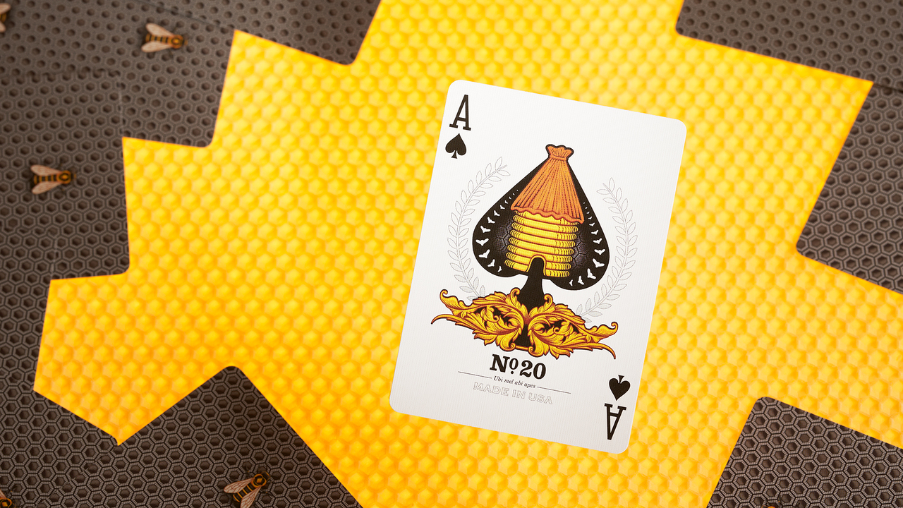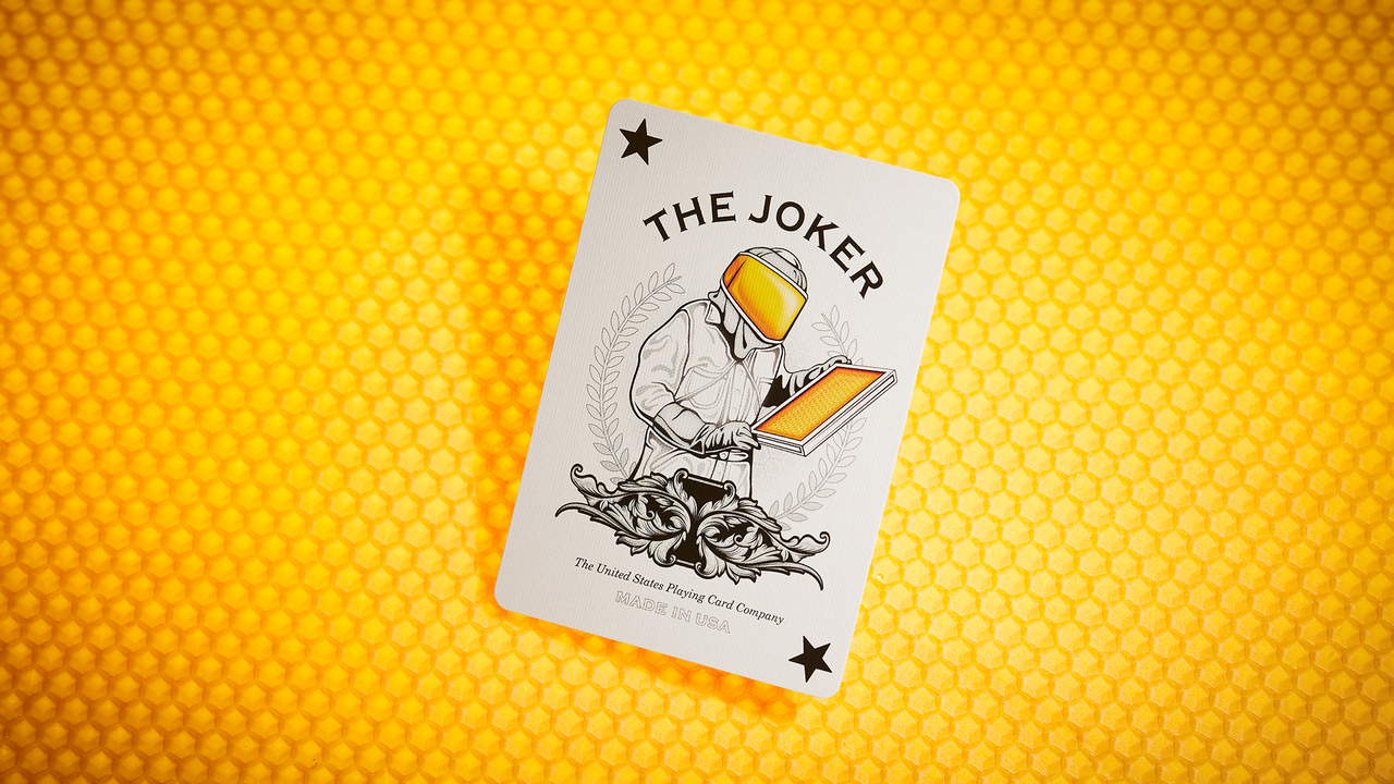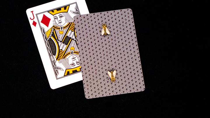 The faces are in a traditional style, with our timeless Beehive Ace of Spades and Beekeeper Jokers, plus a deeper high-roller red used for the Hearts and Diamonds. We've created a custom color scheme and background pattern on all of the court cards.