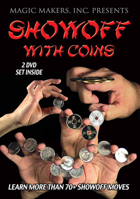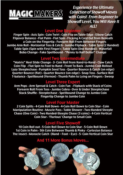 Learn over 70 showoff moves with coins in this two DVD set! You'll learn easy moves such as the basic elbow catch to complicated flourishes like the 10 Coin Roll Out!