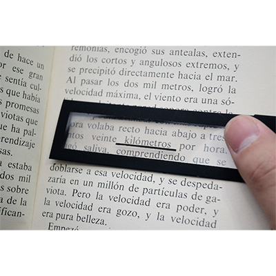 EFFECT: The magician makes a prediction and asks a spectator to open a page in the book, which says the number page or simply choose one randomly while going quickly through the pages. The artist has on his hand a TRANSPARENT bookmark and the viewer will tell where to place it: on the first lines of the page selected, in the middle or the end of it... after the spectator's free decision (both the page and where to place the bookmark), the illusionist will show him the transparent bookmark has a line, and that it highlights a word on the text... the viewer reads the word and it incredibly matches the prediction!