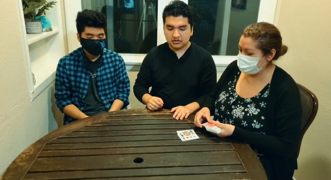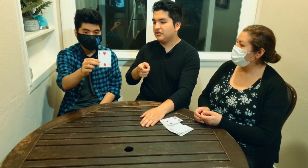 Imagine the performer has two spectators sitting next to him, as he hands the deck to one of the spectators to shuffle the deck, as the other spectator will close their eyes and ask to imagine a playing card in their head without even saying or looking at anything. The spectator with the shuffle deck and deal the cards as they can stop wherever they want face down, even the performer and the spectators can't see what card was stopped. For a surprise the spectator who was thinking of a card with his/her eyes close will guess the card that was dealt on the table.