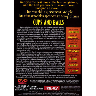 The other notable thing about the Cups and Balls is the amount of individuality that magicians can bring to their interpretation of the effect and you'll find no better example of that than the seven performers you'll meet on this DVD. Tommy Wonder begins our journey with his wonderfully self-contained routine with just two cups and two surprise productions and all with no pocket loads! Frank Garcia offers a wide variety of various moves and bits of business with the Cups and Balls, ready to add to your favorite routine, while Dan Fleshman demonstrates his famous sequence with the Cups and Balls, including his amazing five-ball "Fleshman Flash" final load. Aldo Colombini is up next, demonstrating an elegant silent routine that he used to win a prize at FISM followed by the Professor himself, Dai Vernon, along with Michael Ammar, Gary Ouellet and Steve Freeman, discussing and dissecting perhaps the most popular Cups and Balls routine in magic, the Dai Vernon Cups and Balls. Alex Elmsley is next with a great routine that climaxes with a production you have to see to believe while Ross Bertram presents a multi-phase routine with many original sequences that will fool even seasoned Cups and Balls workers.