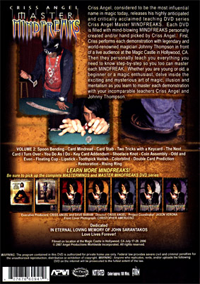 Criss Angel, considered to be the most influential name in magic today, releases his highly anticipated and critically acclaimed teaching DVD series Criss Angel Master MINDFREAKS. Each DVD is filled with mind-blowing MINDFREAKS personally created and/or hand picked by Criss Angel. First, Criss performs each demonstration with legendary and world-renowned magician Johnny Tompson in front of a live audience at the Magic Castle in Hollywood, CA. Then they personally teach you everything you need to know step-by-step so you too can master each MINDFREAK. Whether you are young or old, a beginner or a magic enthusiast, delve inside the exciting and mysterious art of magic, illusion and mentalism as you learn to master each demonstration with your incomparable teachers Criss Angel and Johnny Tompson.