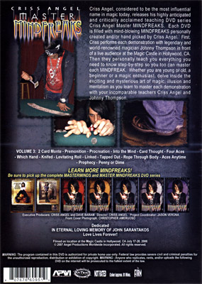 Criss Angel, considered to be the most influential name in magic today, releases his highly anticipated and critically acclaimed teaching DVD series Criss Angel Master MINDFREAKS. Each DVD is filled with mind-blowing MINDFREAKS personally created and/or hand picked by Criss Angel. First, Criss performs each demonstration with legendary and world-renowned magician Johnny Tompson in front of a live audience at the Magic Castle in Hollywood, CA. Then they personally teach you everything you need to know step-by-step so you too can master each MINDFREAK. Whether you are young or old, a beginner or a magic enthusiast, delve inside the exciting and mysterious art of magic, illusion and mentalism as you learn to master each demonstration with your incomparable teachers Criss Angel and Johnny Tompson.