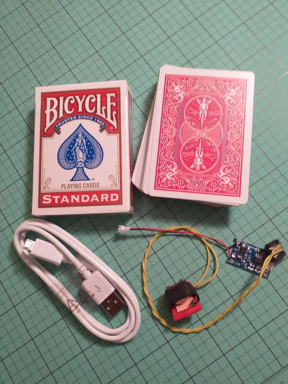 Electronic Magic does not have to be expensive. The well known Haunted Deck is now Electronic Remote control.No invisible threas, magnets,vibrator. Show the spectator a deck of cards, and ask the person to select one and sign it (optional). Place the card back to the middle of the deck and place the whole deck on the floor, table, or any place, even the spectator hand, because it almost noiseless. Step away some distance (more than 4 feet) and call the ghosts to find their card !!!!. Suddenly the half part of the deck moves forward, and next backward, leaving one card, exactly the chosen card!!! It is Remote controlled (very small control, that can be placed on your sock and buttom pressed by your toe). The Deck uses Lipo Rechargeable battery and you receive charger board, charger cable, remote control, batteries, everything you need to perform the trick, instruction manual. Note: The deck of cards cannot be given for examination. Aprox. 20 cards are free. Note: unless specified, the deck can be Red or Blue deck. You can see demo on...https://youtube.com/shorts/Ux9XJL8zFTgI