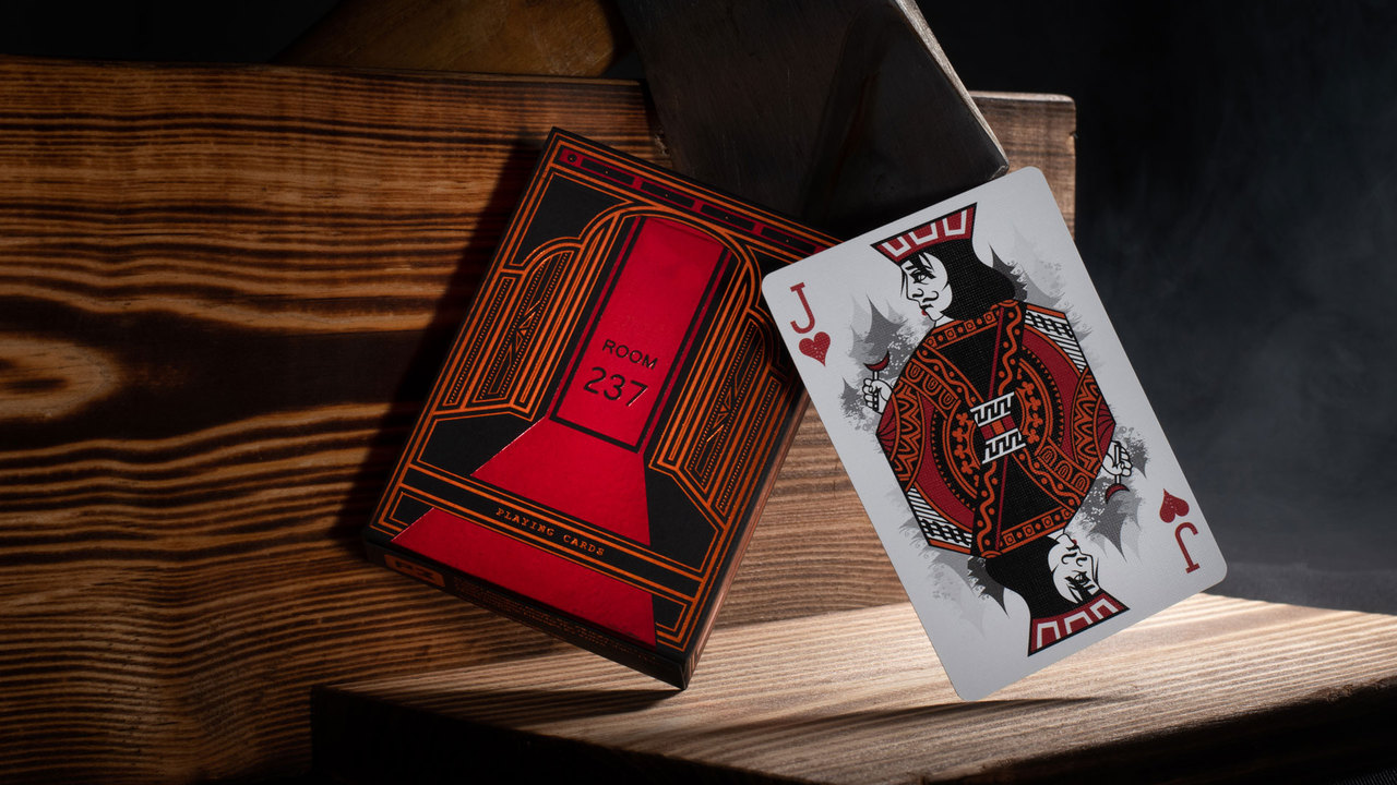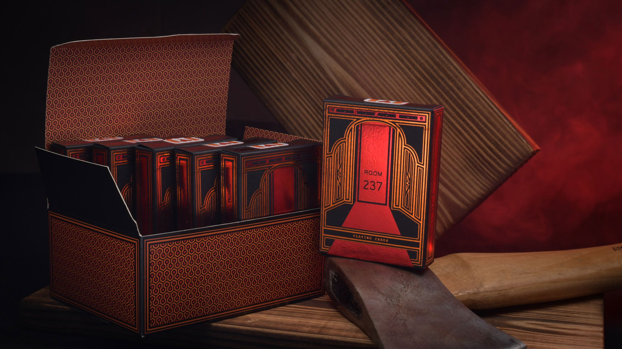 Available singly or in 6-packs with custom half brick boxes, Room 237 decks are printed by the United States Playing Card Company. The cards are printed using vegetable-based inks and starch-based laminates on FSC-certified paper sourced from sustainable forests. This means the cards not only shuffle, fan, and spread perfectly for all of your favorite games & tricks, they're made with the planet in mind!