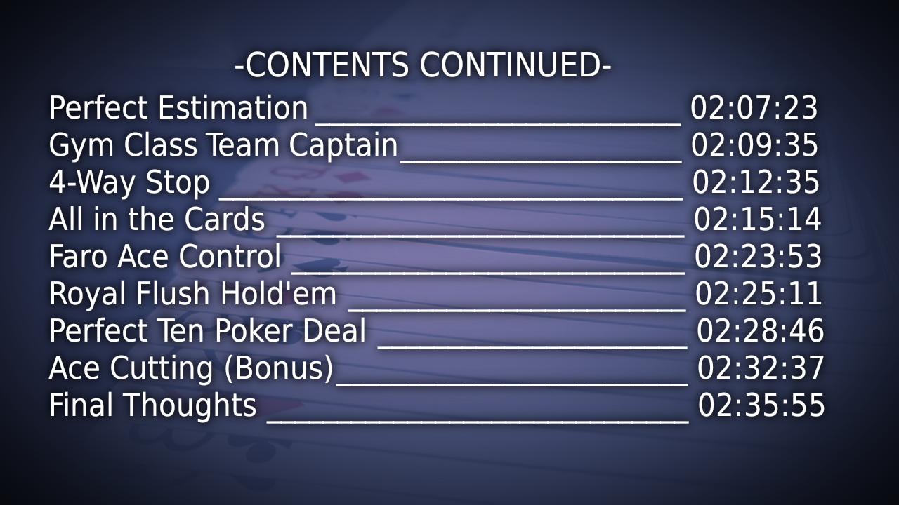 Carl teaches a simplification on the original stack that makes memorization and recall even MORE accessible! Also included is a classic 10 card poker routine that is inherent to this simplified stack AND a method for assembling a called 4 of a kind directly from the stack!