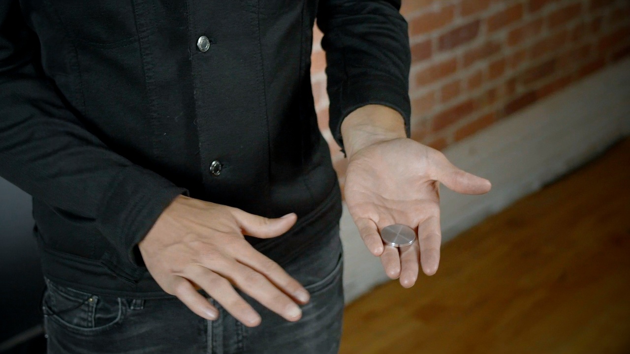 The magician displays a flat disk that is about the size of a coin. It is in fact what a coin looks like before the US Mint stamps it into actual currency. The disk is shown on the front and then back, and then placed into the spectator’s hand. The magician waves their hand over the disk and it visually transforms into a real coin that can be given away.
