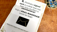 The magician fails trying to find the signed card, so he decides to use his insurance to fix the mistake. He opens the insurance policy to see if he is covered for this, and after a lot of comedy he finally finds the signed card inside to the golden envelope in a very impossible way.