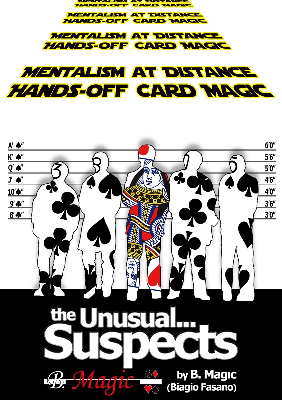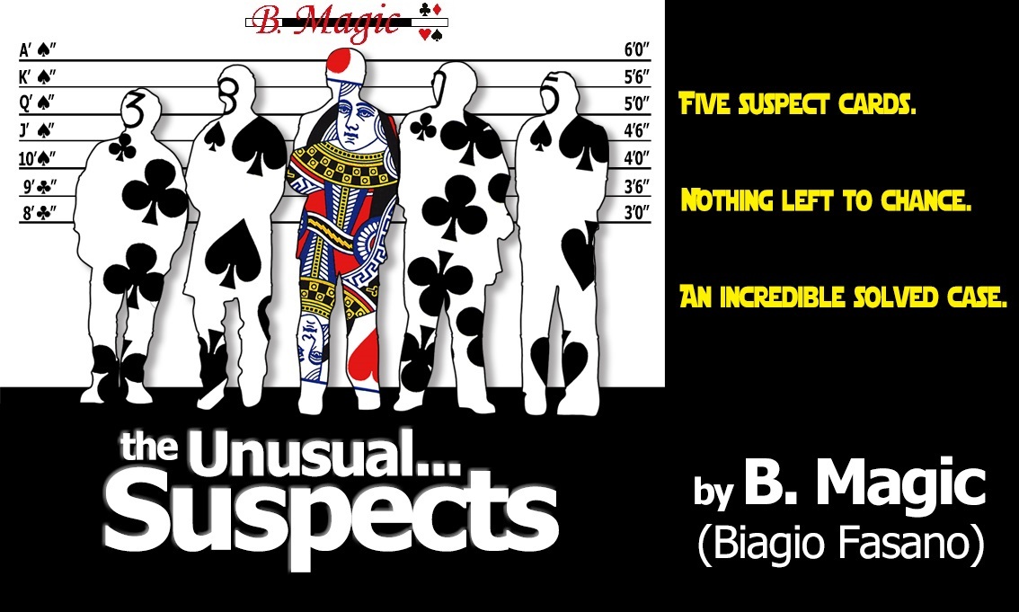 An impromptu mentalism effect with just few cards, possible from a distance (in a video chat or even just on the phone), whose story is very loosely inspired by the movie "The Unusual Suspects" and in which the spectator is asked to choose five random cards from the deck. They will represent the suspects of a major bank robbery. Only one will be the real culprit. Despite the free arrangement of the cards and the various shuffles of face-up and face-down cards, in the end the mentalist will always succeed to guess all of these:
