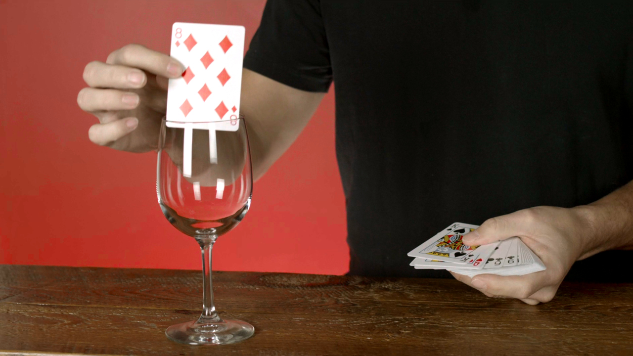 The performer displays a single red card in a glass as well as a blue-backed deck that can be displayed on the front and the back. The red card is placed onto the blue deck and then cut into the deck. The audience collectively chooses a card. What they say is what they get. The card they choose is the card that is removed from the deck. Impossibly, the card the audience selected is the red card.