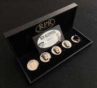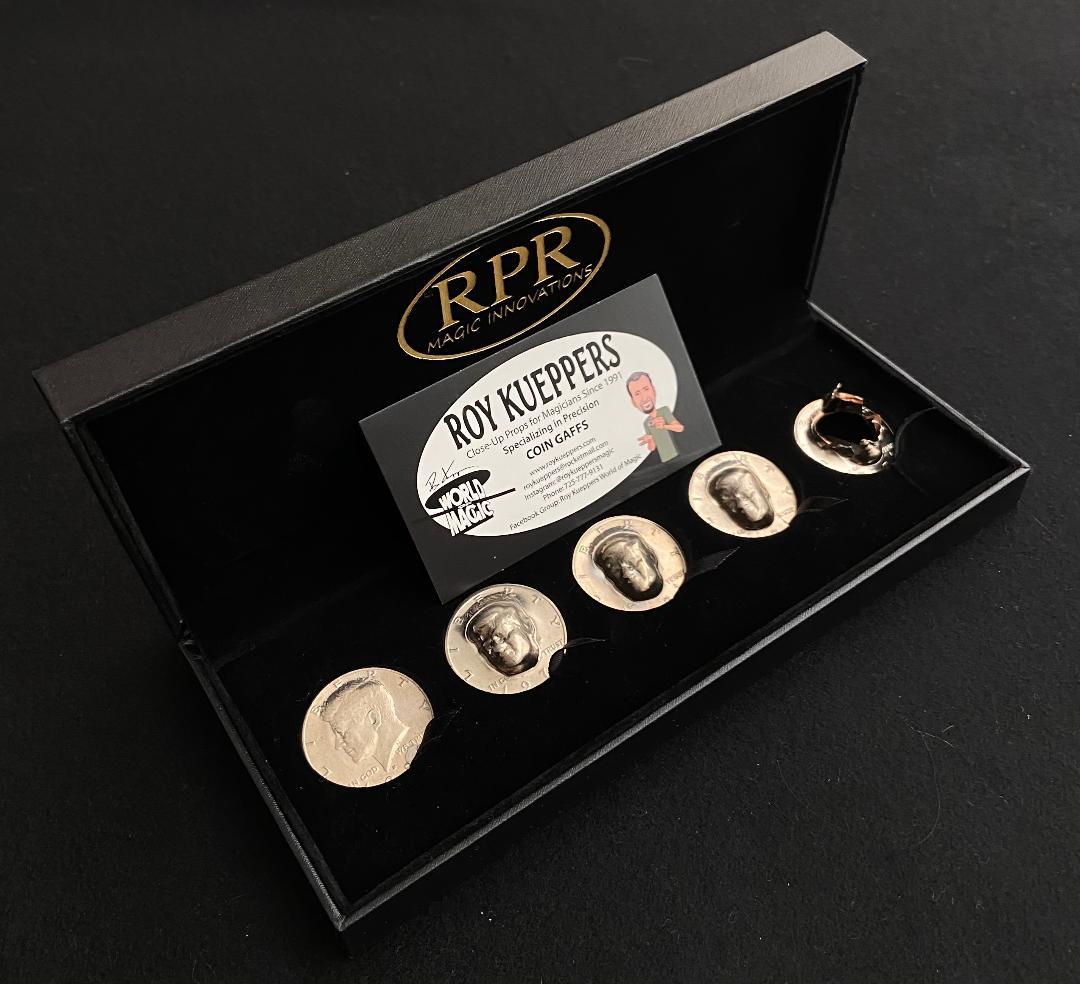 This ultimate coin magic collection includes five coins, all with matching dates: one regular Kennedy half dollar, one Protruding Kennedy with pushed-through back, one Protruding Kennedy with a flush back, one Protruding Folding Kennedy, and one 3-D Radical Karate Kennedy coin. The collection ships in a premium protective case that doubles as a durable travel storage box.